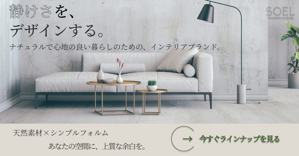 ナチュラル志向の20〜40代女性をターゲットにした、インテリアブランドの広告バナーです。ECサイトやSNS広告での使用を想定し、「落ち着き」「余白」「上質さ」を軸にデザインしました。