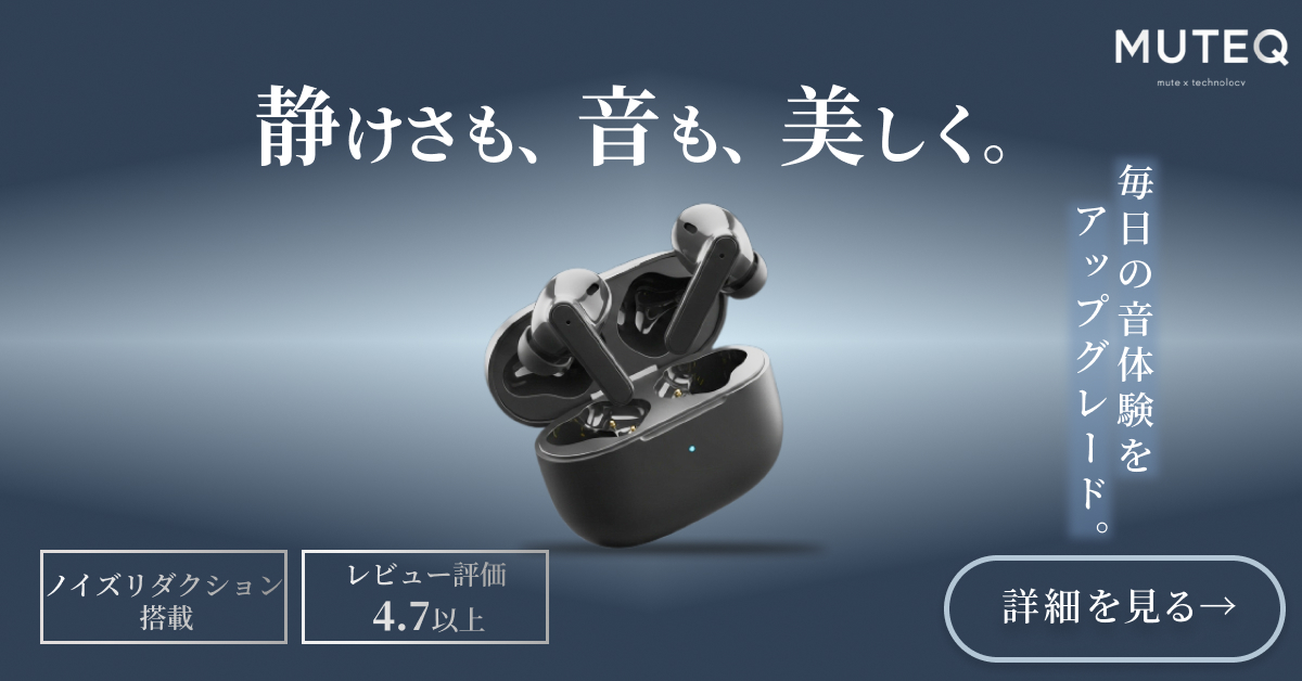 ダークトーンをベースに中央へ光を集めることで、プロダクトに視線が集まる構成に。コピーは短く力強い表現にし、スペック訴求(ノイズリダクション・レビュー評価)と組み合わせて購買意欲を高めています。